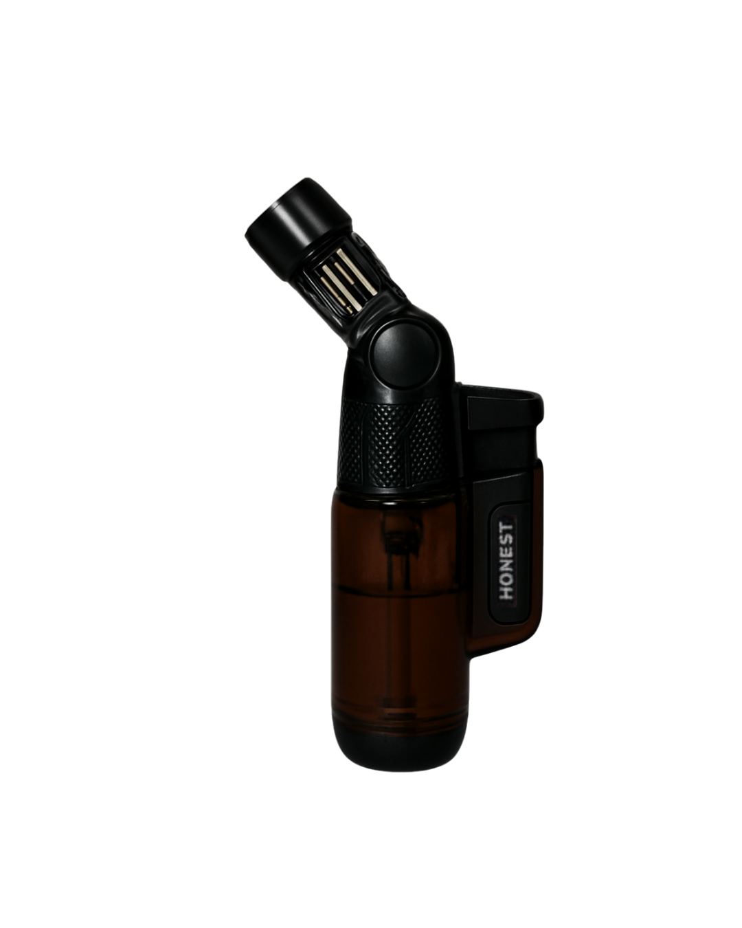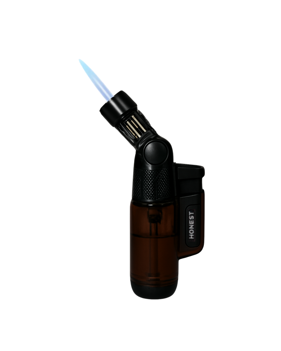 Maçarico com 1 chama, cor marrom com qualidade Honest. Recarregável a gás butano e chama ajustável.