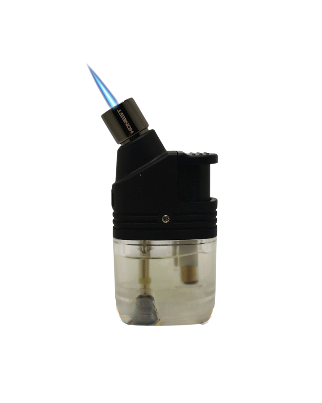 Maçarico com 1 chama, cor transparente com qualidade Honest. Recarregável a gás butano e chama ajustável.