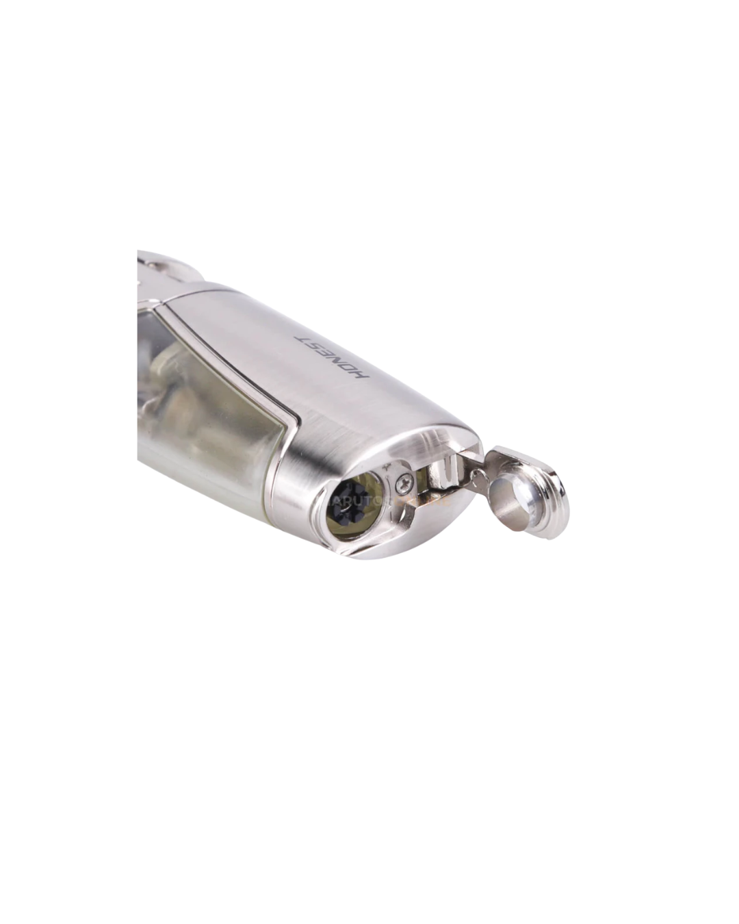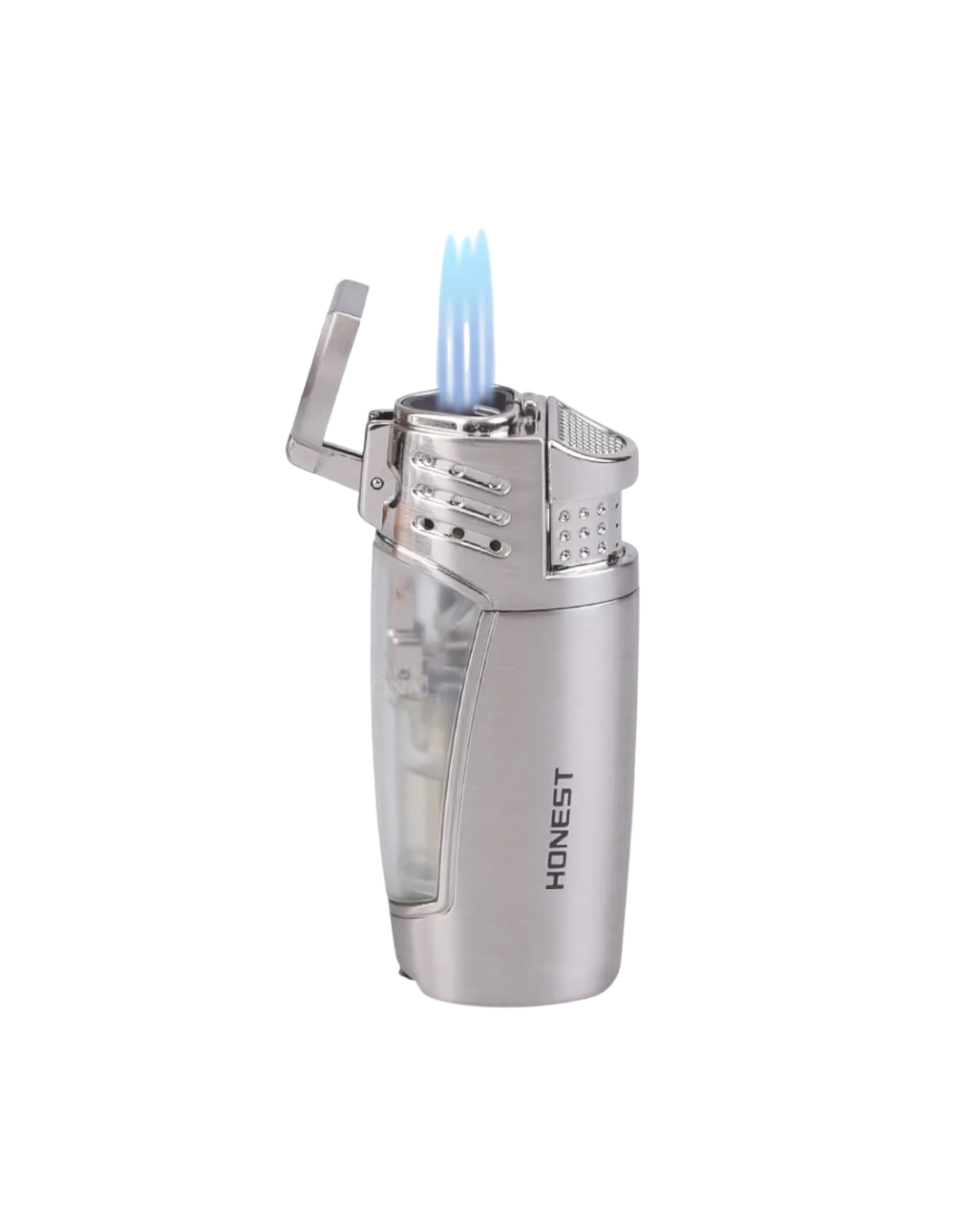 Maçarico com 3 chamas e furador, prata com qualidade Honest. Recarregável a gás butano e chama ajustável.